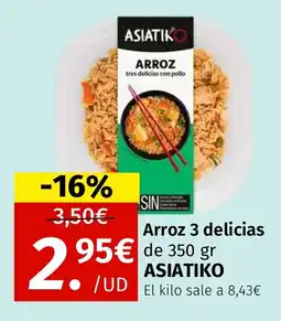 | ASIATIKO Arroz 3 delicias 350 g | Maskom Supermercados | 3,50 € | 2,95 € | -16% | 27 marzo 2026 | 03 mayo 2026 | |