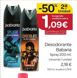 1Supermercados El Jamón BABARIA Desodorante ofertaBABARIA Desodorante 200 mlSupermercados El Jamón2,18 €1,09 €-50% 2a unidad08 enero 202628 enero 2026 Mirar oferta