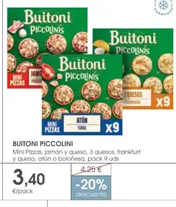 | BUITONI PICCOLINI Mini Pizzas, jamón y queso, 3 quesos, frankfurt y queso, atún o boloñesa, pack 9 uds | Supermercados Plaza | 4,25 € | 3,40 € | -20% descuento | 23 abril 2026 | 06 mayo 2026 | |