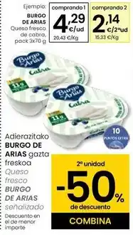 | BURGO DE ARIAS Queso fresco de cabra 3 x 70 g | Eroski | 4,45 € | 2,22 € | -50% de descuento | 14 agosto 2025 | 26 agosto 2025 | |