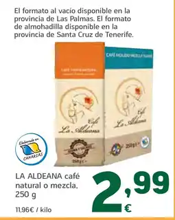 | La aldeana café natural o mezcla, 250 g | HiperDino | 1,35 € | 25 octubre 2021 | 09 noviembre 2021 | |||