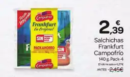 | CAMPOFRIO Salchichas Frankfurt 140 g | Supermercados El Jamón | 2,45 € | 2,39 € | 0,06 € Descuento | 23 octubre 2025 | 12 noviembre 2025 | |