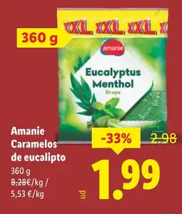 1Lidl AMANI Caramelos de eucalipto ofertaAMANI Caramelos de eucalipto 360 gLidl2,98 €1,99 €-33%12 enero 202618 enero 2026 Mirar oferta