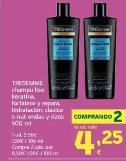 | TRESEMMÉ champú liso keratina, fortalece y repara, hidratación, clásico o nut ondas y rizos 400 ml | HiperDino | 4,25 € | 09 abril 2026 | 22 abril 2026 | |||