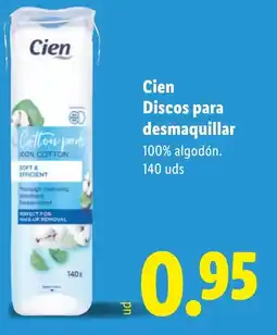 Actualmente hay varias promociones activas para Cien, disponibles en Lidl y otras grandes cadenas. Se incluyen acciones como 1+1 gratis, 25 % de descuento o precios promocionales en productos como CIEN/CIEN MEN Desodorante, CIEN Discos para desmaquillar y CIEN Manteca corporal. Con los filtros puedes seleccionar fácilmente por formato, contenido o marca preferida.