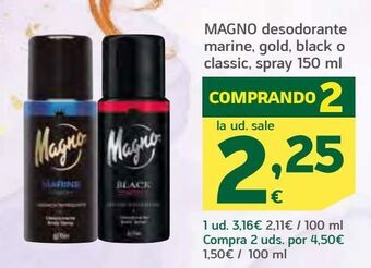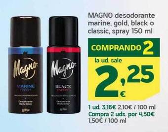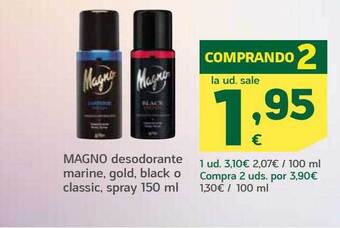 | Magno desodorante marine, gold, black o classic, spray | HiperDino | 3,16 € | 07 julio 2022 | 20 julio 2022 | |||