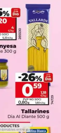 2Dia DIA AL DIANTE Tallarines ofertaDIA AL DIANTE Tallarines 500 gDia0,80 €0,59 €-26%28 enero 202603 febrero 2026 Mirar oferta