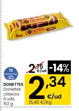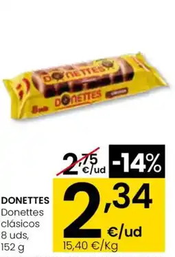 Supermercados El Jamón DONETTES Clásicos ofertaDONETTES Clásicos 152 gSupermercados El Jamón2,75 €2,39 €0,36 € Descuento08 enero 202628 enero 2026
