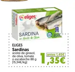 1Hiper Usera ELIGES Sardinas ofertaELIGES Sardinas 88 gHiper Usera1,35 €28 enero 202614 febrero 2026 Mirar oferta