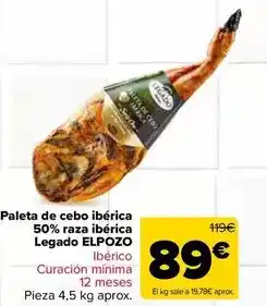 | Legado elpozo - paleta de cebo iberica 50% raza iberica | Carrefour Market | 119,00 € | 89,00 € | 30,00 € Descuento | 23 abril 2026 | 11 mayo 2026 | |
