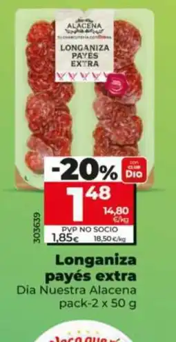 | DIA NUESTRA ALACENA Longaniza payés extra 2 x 50 g | Dia | 1,85 € | 1,48 € | -20% | 04 febrero 2026 | 10 febrero 2026 | |