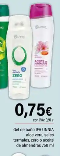 | IFA UNNIA Gel de baño aloe vera, sales termales, zero o aceite de almendras 750 ml | Cash Ifa | 0,75 € | 04 febrero 2026 | 18 febrero 2026 | |||