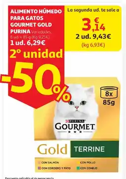 | PURINA Alimento húmedo para gatos gourmet gold | Alcampo | 6,29 € | 3,14 € | 3,15 € Descuento | 21 abril 2026 | 04 mayo 2026 | |