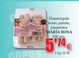 | MARÍA ROSA Flamenquín lomo, jamón, pimientos 500 g | Congelados Copos | 5,74 € | 05 marzo 2026 | 18 marzo 2026 | |||