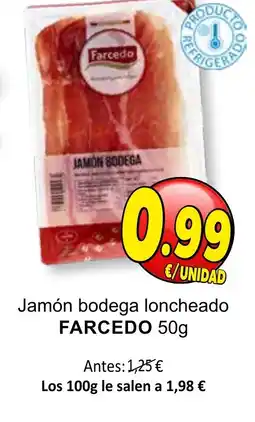| FARCEDO Jamón bodega loncheado 50 g | SPAR | 1,25 € | 0,99 € | 0,26 € Descuento | 02 marzo 2026 | 16 marzo 2026 | |
