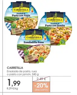| CARRETILLA Ensalada de pasta, rusa o pasta con jamón 240 g | Supermercados Plaza | 2,49 € | 1,99 € | -20% descuento | 23 abril 2026 | 06 mayo 2026 | |