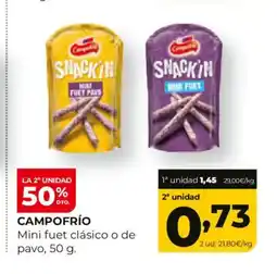 Actualmente hay varias promociones activas para Mini fuet, disponibles en SPAR Fragadis y otras grandes cadenas. Se incluyen acciones como 1+1 gratis, 25 % de descuento o precios promocionales en productos como Campofrío - mini fuet snack'in, CAMPOFRÍO Mini fuet clásico o de pavo y EL CASTILLO Llet sencera o semi. Con los filtros puedes seleccionar fácilmente por formato, contenido o marca preferida.