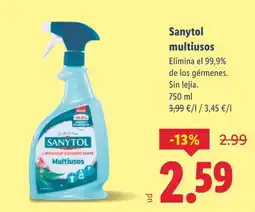 | 1 | SANYTOL Multiusos 750 ml | Lidl | 2,99 € | 2,59 € | -13% | 16 marzo 2026 | 22 marzo 2026 | Mirar oferta | |