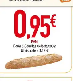 | Pan barra 5 semillas selecta 300 g | Masymas | 0,95 € | 29 enero 2026 | 25 febrero 2026 | |||