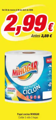 | 1 | Mihogar - papel cocina | Aquabel Perfumerías | 3,59 € | 2,99 € | 0,60 € Descuento | 30 marzo 2026 | 26 abril 2026 | Mirar oferta | |