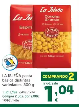 | LA ISLEÑA pasta básica distintas variedades 500 g | HiperDino | 1,04 € | 09 abril 2026 | 22 abril 2026 | |||