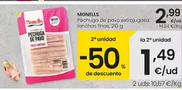 Aliprox MONELLS Pechuga de pavo extrajugosa lonchas finas ofertaMONELLS Pechuga de pavo extrajugosa lonchas finas 210 gAliprox2,99 €1,49 €2a al 50%15 enero 202627 enero 2026