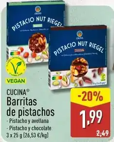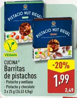 2ALDI CUCINA Barritas de pistachos ofertaCUCINA Barritas de pistachos 3 x 25 gALDI2,49 €1,99 €-20%13 abril 202619 abril 2026 Mirar oferta