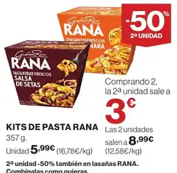 Actualmente hay varias promociones activas para Rana, disponibles en Alcampo y otras grandes cadenas. Se incluyen acciones como 1+1 gratis, 25 % de descuento o precios promocionales en productos como RANA Pasta clásica, RANA Kits de pasta y GIOVANNI RANA 4 Quesos o Jamón y Queso. Con los filtros puedes seleccionar fácilmente por formato, contenido o marca preferida.