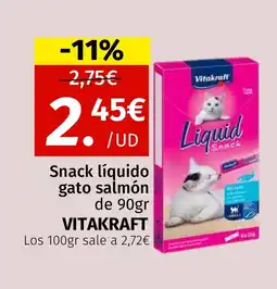 | VITAKRAFTSnack líquido gato salmón 90 gr | Maskom Supermercados | 2,75 € | 2,45 € | -11% | 02 febrero 2026 | 01 marzo 2026 | |