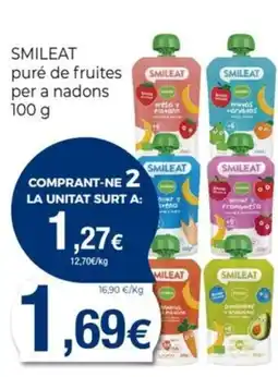 Actualmente hay varias promociones activas para Smileat, disponibles en Maskom Supermercados y otras grandes cadenas. Se incluyen acciones como 1+1 gratis, 25 % de descuento o precios promocionales en productos como SMILEAT Gusanitos eco, SMILEAT puré de fruites SMILEAT per a nadons 100 g y SMILEAT Tarrito verdura merluza. Con los filtros puedes seleccionar fácilmente por formato, contenido o marca preferida.