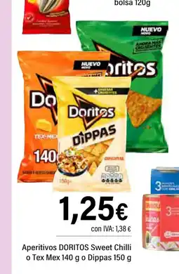 Cash Ifa DORITOS Aperitivos Sweet Chilli o Tex Mex o Dippas ofertaDORITOS Aperitivos Sweet Chilli o Tex Mex o Dippas 140 gCash Ifa1,25 €15 abril 202628 abril 2026