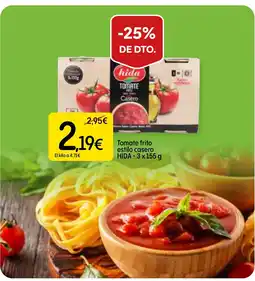 Dialprix HIDA Tomate frito estilo casero ofertaHIDA Tomate frito estilo casero 3 x 155 gDialprix2,95 €2,19 €0,76 € Descuento19 febrero 202611 marzo 2026