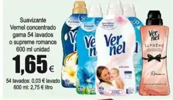 ![]() | Suavizante Vernel concentrado gama 54 lavados o supreme romance 600ml unidad | FROIZ | 1,65 € | 22 julio 2021 | 04 agosto 2021 |