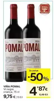 Carrefour Market VIÑA POMAL D.O.Ca. Rioja ofertaVIÑA POMAL D.O.Ca. Rioja 75 clCarrefour Market8,39 €7,99 €0,40 € Descuento25 febrero 202611 marzo 2026