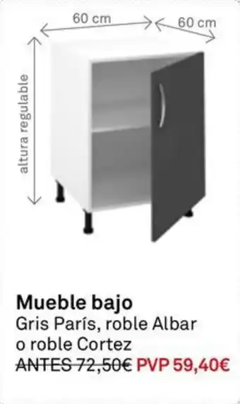 Esta oferta está disponible en varias tiendas, consulta todos los productos para obtener la Mueble bajo más barata. Si quieres saber si este producto tiene un mayor descuento en otra tienda, consulta la categoría 'Bricolaje'. También te pueden interesar estas ofertas: Mueble bajo con cajón, Mueble bajo horno y Mueble bajo fregadero.