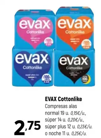 Esta oferta está disponible en varias tiendas, consulta todos los productos para obtener la EVAX Cottonlike más barata. Si quieres saber si este producto tiene un mayor descuento en otra tienda, consulta la categoría 'Supermercados'. También te pueden interesar estas ofertas: EVAX Compresas, EVAX Salvaslip normal y Evax - compresa alas.