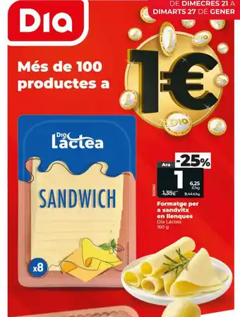 DIA LÁCTEA Formatge per a sandvitx en llenques ahora en promoción en Dia✅ Válido desde el 21-01 hasta el 27-01.