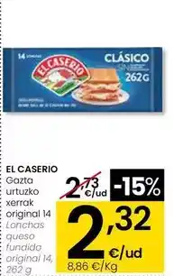 El precio de la El caserío - lonchas queso fundido original se encuentra en la parte superior de la página, junto con las fechas en las que la oferta está disponible. También puede consultar el precio en el Folleto Eroski actual o en el sitio web de Eroski. Las ofertas promocionales le aseguran la compra de productos de Eroski al precio más bajo. ¿Dónde puedo encontrar otras ofertas similares de Eroski?