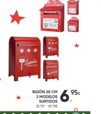 Esta oferta está disponible en varias tiendas, consulta todos los productos para obtener la Buzón 2 modelos surtidos más barata. Si quieres saber si este producto tiene un mayor descuento en otra tienda, consulta la categoría 'Supermercados'. También te pueden interesar estas ofertas: Noria 2 modelos surtidos, Cascanueces 4 modelos surtidos y Casa resina 4 modelos surtidos.