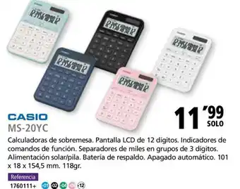 Esta oferta está disponible en varias tiendas, consulta todos los productos para obtener la CASIO MS-20YC más barata. Si quieres saber si este producto tiene un mayor descuento en otra tienda, consulta la categoría 'Libros'. También te pueden interesar estas ofertas: CASIO CASIO FX-82MS-2, CASIO FX-82SP CW y CASIO FX-991SP CW.