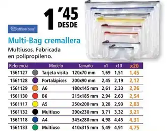 El precio de la Multi-Bag cremallera se encuentra en la parte superior de la página, junto con las fechas en las que la oferta está disponible. También puede consultar el precio en el Catálogo Folder actual o en el sitio web de Folder. Las ofertas promocionales le aseguran la compra de productos de Folder al precio más bajo. ¿Dónde puedo encontrar otras ofertas similares de Folder?