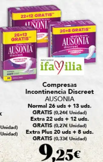 Esta oferta está disponible en varias tiendas, consulta todos los productos para obtener la AUSONIA Incontinencia Discreet más barata. Si quieres saber si este producto tiene un mayor descuento en otra tienda, consulta la categoría 'Supermercados'. También te pueden interesar estas ofertas: AUSONIA Compresas discreet, Ausonia - compresas incontinencia y AUSONIA DISCREET Compresa.