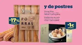 La Sirena ofrece una amplia colección de productos, además de la La sirena - porras fritas. Echa un vistazo al Catálogo La Sirena semanal para encontrar las mejores ofertas y promociones. Además de La sirena - porras fritas, también puedes encontrar las siguientes ofertas: La sirena - porras fritas / profiteroles de nata, Fritas guays - patatas fritas y La sirena - bunuelos de bacalao.
