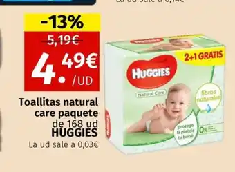 Esta oferta está disponible en varias tiendas, consulta todos los productos para obtener la HUGGIES Toallitas natural care paquete más barata. Si quieres saber si este producto tiene un mayor descuento en otra tienda, consulta la categoría 'Supermercados'. También te pueden interesar estas ofertas: Huggies - extra care bolquer talla, Huggies - panales drynites y HUGGIES DryNites Pijama Pants talla.