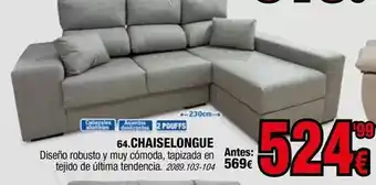 Rapimueble ofrece una amplia colección de productos, además de la Chaiselongue. Echa un vistazo al Catálogo Rapimueble semanal para encontrar las mejores ofertas y promociones. Además de Chaiselongue, también puedes encontrar las siguientes ofertas: 60 chaiselongue, Chaiselongue reversible y Confort - chaiselongue.