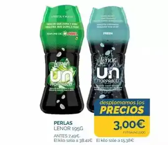 Esta oferta está disponible en varias tiendas, consulta todos los productos para obtener la Lenor - perlas más barata. Si quieres saber si este producto tiene un mayor descuento en otra tienda, consulta la categoría 'Supermercados'. También te pueden interesar estas ofertas: Lenor - perlas perfumadas fresh unstoppables, En todos los suavizantes lenor y perlas unstoppables, y LENOR Suavizante perlas frescor abril.